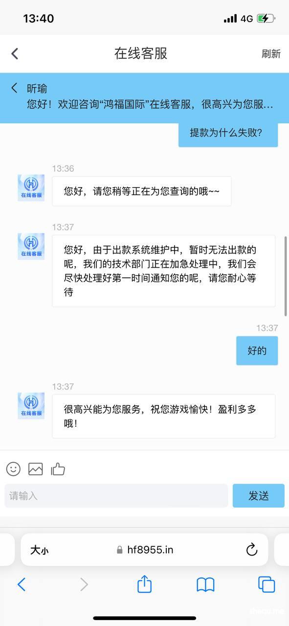 鸿福国际 网址https://m.hf8955.in 300块钱出不起 一直说系统维护