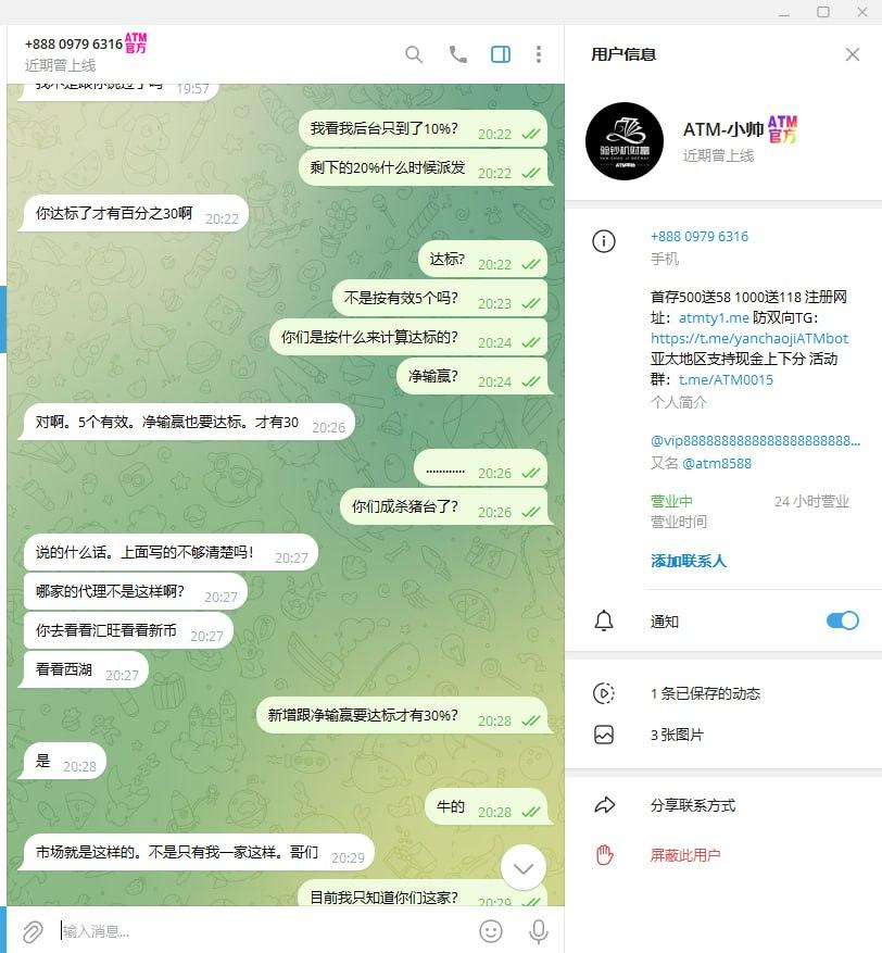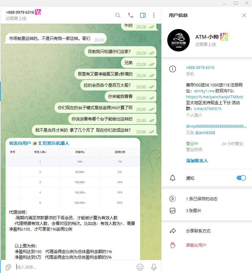 我是3月就在ATM做的代理,当时都是谈好的55%返佣,直到7月中旬后说变动了,当时咨询问了说是5个活跃30%,现在开始玩文字游戏了,30%的返佣还要配合你代理的净输赢达到30W+的情况下才能领取,试问这不就成了3%的返佣政策了吗?3%的返佣模式有代理会去推广吗,一个给你推广平台带来输赢的代理还比不上你们一个员工拿的返点多,实在是高招,不知道是不是平台杀一波要跑路了 ,现在我已经把会员都转移了,希望各位代理玩家避雷。