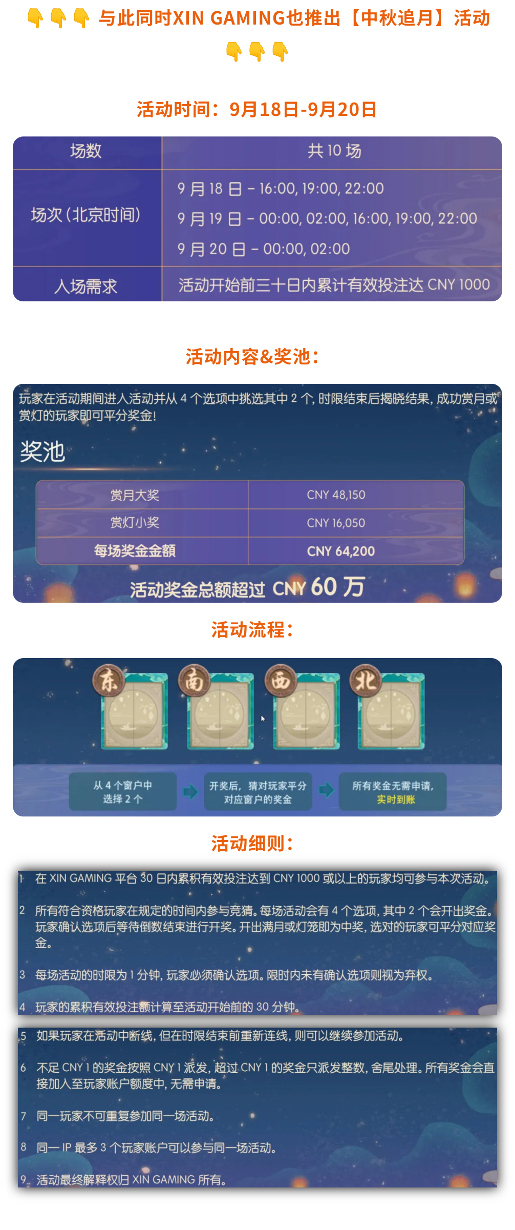 玩家在活动期间进入活动并从 4 个选项中挑选,时限结束后揭晓结果,成功赏月或赏灯的玩家即可平分奖金 !